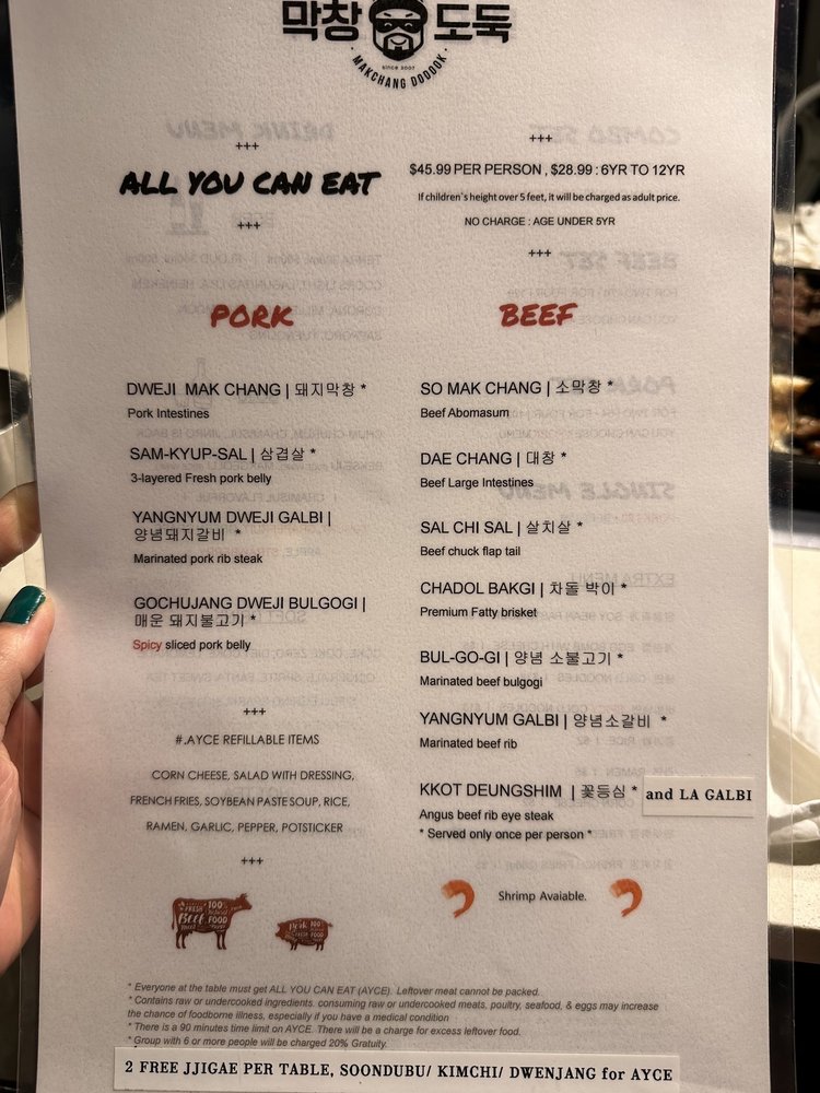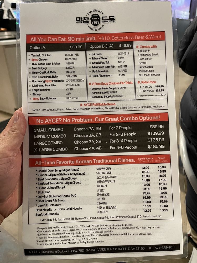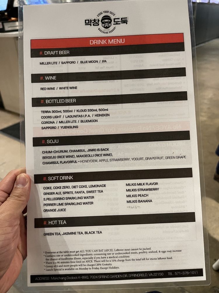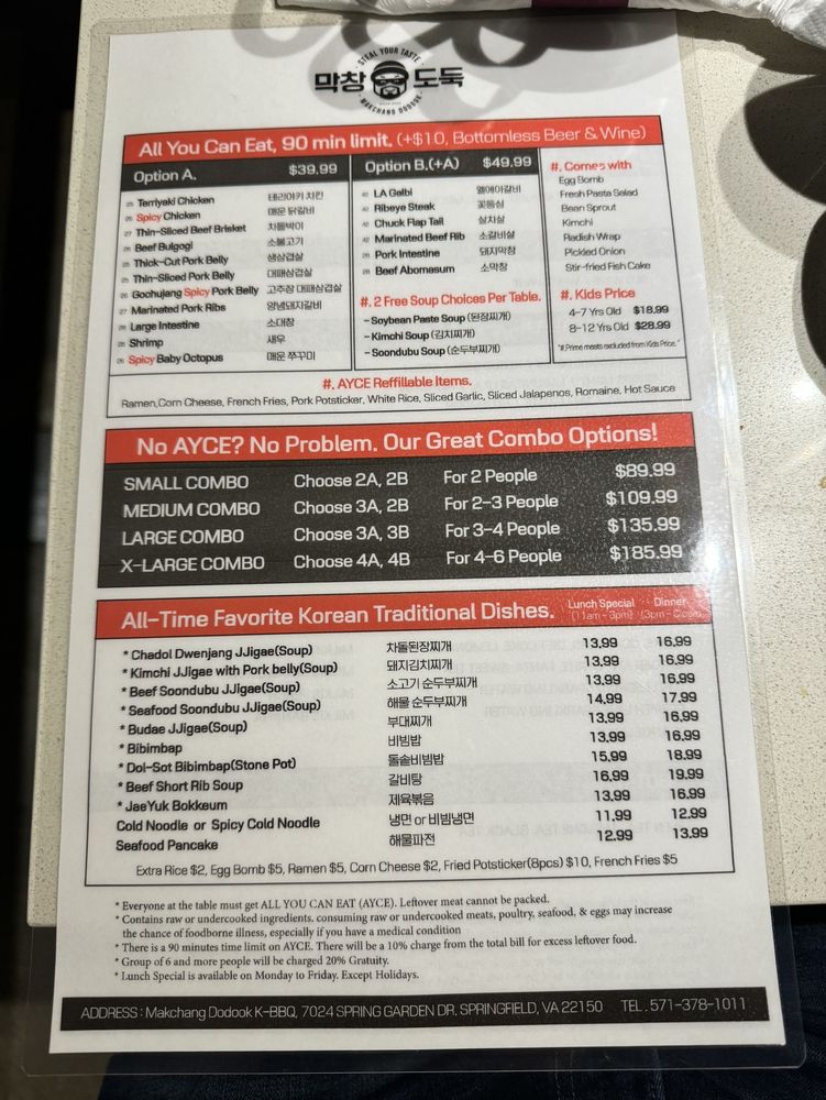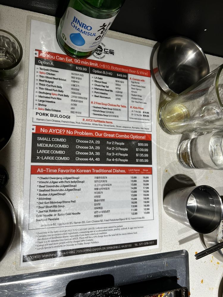 Makchang Dodook Korean BBQ is a top-notch spot for Korean barbecue enthusiasts, offering a variety of traditional dishes like Chadol Bakgi, Yangnyum Dweji Galbi, and Seafood Pancake. Located in Springfield, VA, this restaurant provides a cozy and intimate dining experience with amenities such as outdoor seating, free Wi-Fi, and a full bar. Customers rave about the quality of the meats and the delicious banchan options like spicy beansprouts and corn cheese. The friendly and attentive service adds to the overall dining experience, making it a great place for gatherings with friends and family. While the prices may be a bit higher, the exceptional flavors and generous portions make it worth the cost. If you're in the area and craving authentic Korean BBQ, Makchang Dodook is definitely worth a visit.